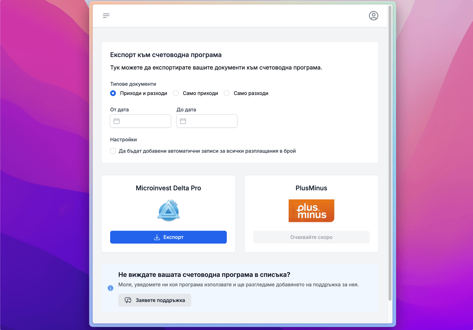 - Експорт към счетоводен софтуер